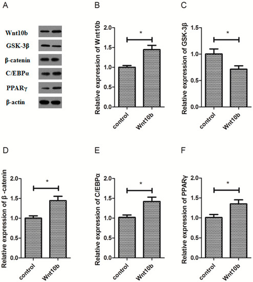 3.2. Effect of Wnt10b Gene Overexpression on the Protein Expression of Wnt10b, GSK-3β, β-catenin, C/EBPα, and PPARγ
