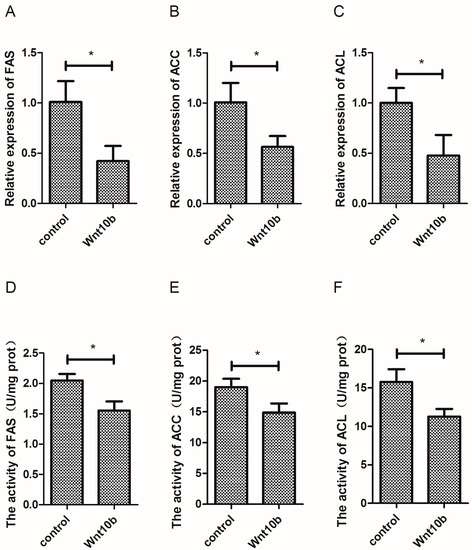 3.3. Effect of Wnt10b Gene Overexpression on the Gene Expression and Activity of Fatty Acid Synthetase (FAS), Acetyl-CoA Carboxylase (ACC) and ATP-Citrate Lyase (ACL),