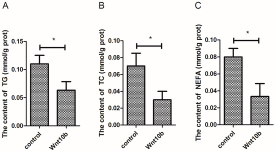 Effect of Wnt10b gene overexpression on the content of triglyceride (TG), total cholesterol (TC), and non-esterified fatty acids (NEFA) in the muscle. (A) TG; (B) TC; (C) NEFA. Values are expressed as means ± s.e.m. (n = 4). Statistically significant differences are denoted by an asterisk (* p < 0.05).