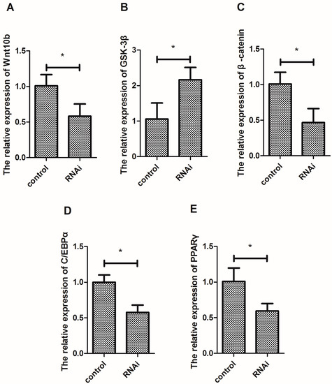 The interference of Wnt10b gene significantly decreased the mRNA expression of Wnt10b and β-catenin (Figure 5A,C), but significantly increased the expression of GSK-3β in the muscle (Figure 5B). Moreover, silencing Wnt10b gene significantly decreased the mRNA expression of C/EBPα and PPARγ (Figure 5D,E).