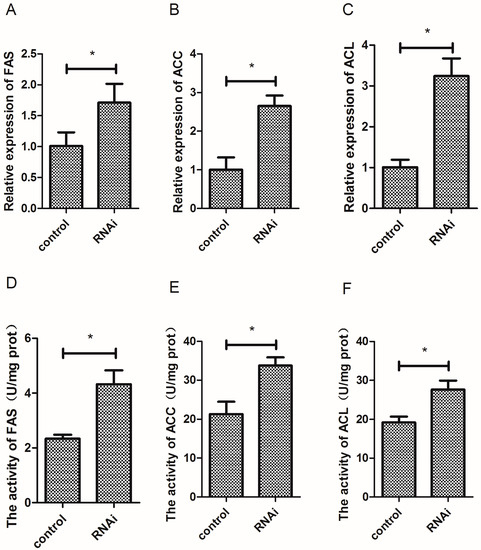 Effect of Wnt10b gene interference on the mRNA expression and activity of Fatty Acid Synthetase (FAS), Acetyl-CoA Carboxylase (ACC), and ATP-Citrate Lyase (ACL) in the muscle of zebrafish. (A) The mRNA expression of FAS; (B) The mRNA expression of ACC; (C) The mRNA expression of ACL; (D) The activity of FAS; (E) The activity of ACC; (F) The activity of ACL. Values are expressed as means ± s.e.m. (n = 4). Statistically significant differences are denoted by an asterisk (* p < 0.05).