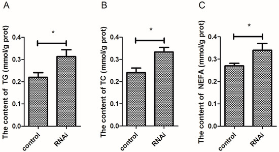 Effect of Wnt10b gene interference on the content of triglyceride (TG), total cholesterol (TC), and non-esterified fatty acids (NEFA) in the muscle. (A) TG; (B) TC; (C) NEFA. Values are expressed as means ± s.e.m. (n = 4). Statistically significant differences are denoted by an asterisk (* p < 0.05).