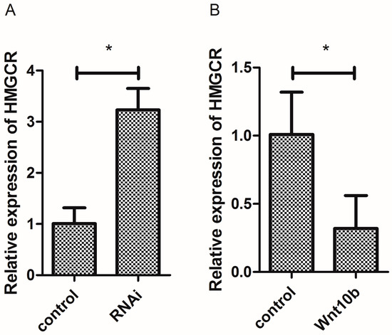 Wnt10b gene interference significantly induced the mRNA expression of HMGCR, while Wnt10b gene overexpression significantly decreased the expression of HMGCR (Figure 9A,B).