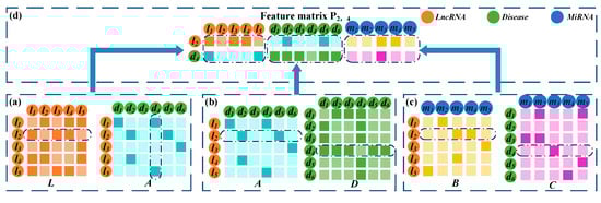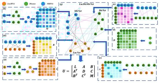 The heterogeneous network LncDisMirNet was constructed by combining LncNet, DisNet, and MirNet. LncDisMirNet is denoted by the matrix ,