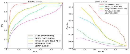 As shown in Figure 4b and Table 2, GCNLDA had the best performance for 405 diseases (AUPR = 0.2233). It was 16.4% better than SIMCLDA, 7.17% better than Ping’s method, 18.45% better than MFLDA, and 9.64% better than LDAP. GCNLDA achieved the best performance for nine of the ten well-characterized diseases.