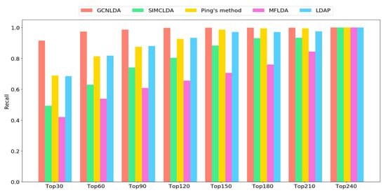 The preceding equation shows that recall is the ratio of correctly identified positive examples to all positive examples. The number of positive examples appearing as top k lncRNA candidates of the disease increases with the corresponding recall. Researchers usually select the top-ranked candidates from the prediction results for experimental verification. Thus, it is reasonable to use high Recall values. Therefore, we also calculated the recall values of the top 30, 60, 90…210, 240 candidates for ten diseases.
