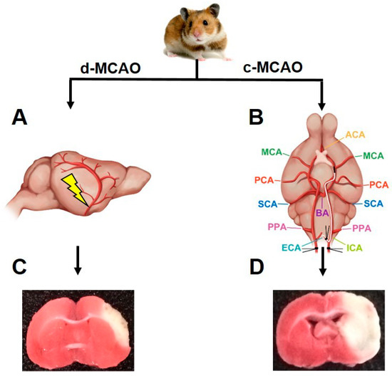 Representative diagram of cerebral ischemic hamster models using distal middle cerebral artery occlusion (d-MCAO) and contralateral middle cerebral artery occlusion (c-MCAO). (A) Model representing d-MCAO, in which blood flow is blocked by electrocoagulating the distal middle cerebral artery. (B) Model representing c-MCAO, in which a silicon-coated intraluminal suture occludes the origin of the MCA. The right external carotid artery (ECA) is ligated and cauterized to a stump, where the suture goes through into the artery from internal carotid artery (ICA) to MCA, simultaneous ligation of the contralateral CCA is performed for 40 min. ACA, anterior cerebral artery; PCA, posterior cerebral artery; SCA, superior cerebellar artery; BA, basilar artery; PPA, pterygopalatine artery. (C,D) 2, 3, 5-triphenyltetrazolium chloride (TTC) staining; white area indicates the infarct and red area is the normal tissue.