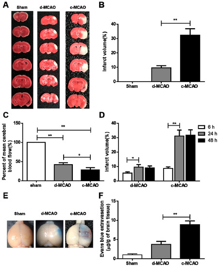 Comparison of the severity of ischemic strokes induced by d-MCAO and c-MCAO. Wild-type (WT) hamsters were subjected to d-MCAO and c-MCAO for 24 h.(A) Representative images of six coronal brain sections stained with 2, 3, 5-triphenyltetrazolium chloride (TTC) staining. (B) Quantification of the infarct volumes in Sham, d-MCAO, and c-MCAO from (A) (n = 6/group). (C) Measurement of cerebral blood flow after ischemia by laser Doppler transducer (n = 6–8/group). (D) Time course analysis of infarct volume in ischemic hamsters induced by d-MCAO and c-MCAO (n = 6–8/group). (E) Representative images of the Evan’s blue (EB)-stained whole brains in sham, d-MCAO, and c-MCAO group. (F) Quantification of the Evan’s blue extravasation; data are expressed as mean ± SD. * p < 0.05; ** p < 0.01 versus sham group.