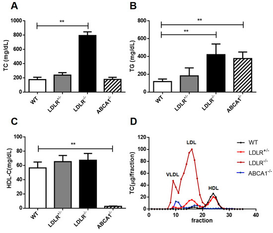 Analysis of plasma lipid profiles in different ischemic hamster models fed on chow diet. (A–C) Plasma total cholesterol (TC) (A), triglyceride (TG) (B) and high-density lipoprotein cholesterol (HDL-C) (C) were determined in male WT, LDLR+/–, LDLR–/– and ABCA1–/– hamsters after 12 h fasting (n = 8/group). (D) Fast-protein liquid chromatography (FPLC) analysis of the lipoprotein distribution in pooled plasma from different groups (n = 6/group). Data are expressed as mean ± SD. * p < 0.05; ** p < 0.01 versus WT group.