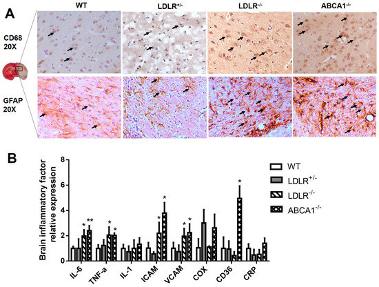 3.3. Enhanced Brain Inflammation in LDLR–/– and ABCA1–/– Hamsters with IS.