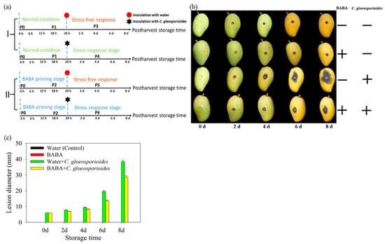 Outline of the platform used for β-aminobutyric acid (BABA)-priming mechanism investigation. (a) Mango fruit were non-primed (I) or BABA-primed (II) before inoculation of C. gloeosporioides during postharvest storage; (b) Visual image of anthracnose disease in mango fruit after different treatments; (c) Lesion diameter of mango fruit after different treatments.