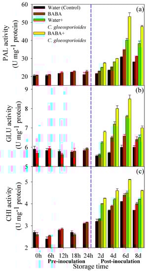 PAL activity increased within the first 6 days of storage, then declined slightly (Figure 3a). During early storage time (first 24 h), BABA treatment had no effect on PAL activity, but from day 2, BABA induced higher PAL activity than control (Figure 3a). In response to infection of C. gloeosporioides, fruits treated with BABA possessed the highest PAL activity among fruit with these four treatments (Figure 3a). For GLU and CHI, BABA treatment did not affect their activities within the first 2 days of storage (Figure 3b,c). From day 4 to day 8, BABA-treated fruits had higher GLU and CHI activities. Similar with changing of PAL activity, GLU and CHI activities in BABA + C. gloeosporioides were higher than those in Water + C. gloeosporioides from day 2 to day 8 (Figure 3b,c).