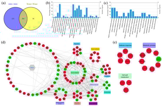 Differentially expressed proteins in response to C. gloeosporioides infection in primed fruit and non-primed plants. (a) Venn diagrams showing the number of differentially regulated proteins. BABA+ represents BABA + C. gloeosporioides fruits while Water+ represents Water + C. gloeosporioides fruits. (b) GO analysis of the proteins only differentially regulated in BABA primed fruit. (c) GO analysis of the proteins differentially expressed between BABA+ C. gloeosporioides and Water + C. gloeosporioides. (d) Protein–protein interaction (PPI) analysis of proteins only differentially regulated in BABA primed fruit. (e) PPI analysis of proteins differentially expressed between BABA + C. gloeosporioides and Water + C. gloeosporioides. Red color in D and E represented upregulation while green color represented downregulation.