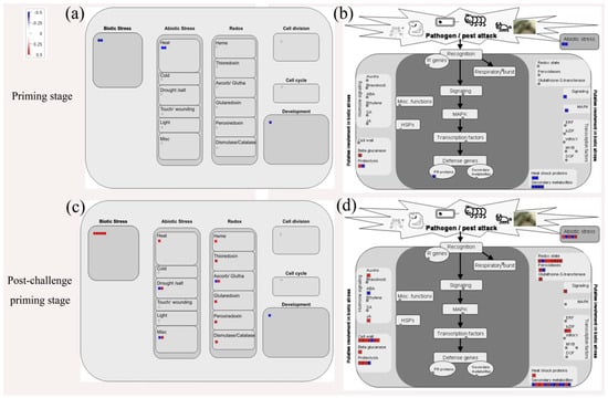Proteins that were differentially regulated in BABA-primed fruit at priming stage and post-challenge priming stage were graphically analyzed and visualized using the MapMan. Proteins that were differentially regulated in BABA-primed fruit at priming stage involved in cell defense (a) and biotic stress (b); proteins that were differentially regulated in BABA-primed fruit at post-challenge priming stage involved in cell defense (c) and biotic stress (d). Up-regulated proteins were presented in red while down-regulated proteins in blue.