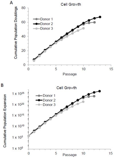 Previous studies have demonstrated that when MSCs were extensively cultured (i.e., passaged continuously), they entered senescence [20,22,42]. In here, we cultured MSCs in 2D as adherent monolayer cultures starting from a low density (100 cells/cm2) and continuously passaged them every seven days. All three MSC preparations (MSC donors) used showed a rapid decline in proliferation rate after passage 7, 8, or 9 and less than one population doubling per seven days of culture at passage 10, 12, or 13, as demonstrated by the growth curves (Figure 1A). To better appreciate how the culture expansion of a small (1 mL) bone marrow aspirate affects cell yields for clinical use, we generated a cumulative population expansion graph. A conservative estimation was made that at the end of passage 0—when the initial bone marrow culture reached approximately 70% confluency, 106 MSCs existed. Using this estimation, the minimally expanded MSCs in passage 2 or 3 provided approximately 1010 cells, while MSCs in passages 7 and 8 provided nearly 1020 cells. The final achievable cell yield could be up to 1025 for donor 2, as shown in Figure 1B. Importantly, since the proliferation rate of MSCs appeared to decline rapidly after passages 7–9, for the purposes of this study, cells expanded to passage 7–9 are considered as extensively expanded.