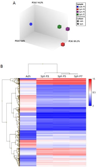 In our previous studies, we demonstrated that MSCs grown in hanging drops aggregated into spheroids [25,26,27,28]. However, previous studies of 3D cultured MSCs had focused on minimally expanded, or early passage cells, whereas in some therapeutic instances, the use of later passage cultures might be necessary. In here, we generated MSC spheroids in hanging drops from adherent monolayer MSCs at passages 3, 5, and 7, and we studied their gene expression profiles with microarrays. Principal component analysis demonstrated that gene expression levels of MSC spheroids generated from all three passages were very similar to each other (Figure 2A). This was further supported by hierarchical clustering of the differentially expressed genes between the spheroids and adherent monolayer MSCs (Figure 2B). A Venn diagram of differentially expressed genes demonstrated that over 50% of these genes were shared by spheres from all three passages (Figure 3A). Spheroids from each passage showed some genes that were differentially expressed in only that passage; however, the number of genes was only 6–15% (Figure 3A). The microarray data suggested that passage 5 and 7 MSC spheroids were slightly more similar to each other than to P3 spheroids, but they still shared many gene expression patterns with the P3 spheroids (Figure 2 and Figure 3A).