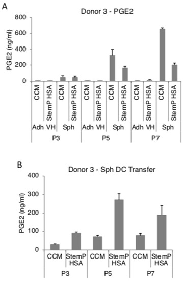 Spheroids generated from extensively expanded MSCs secrete high amounts of prostaglandin E2 (PGE2). MSCs from various passages (3, 5, and 7) were cultured as spheroids and as very high density monolayers in fetal bovine serum (FBS)-containing and xeno-free media. The conditioned medium was harvested for PGE2 ELISA. Spheroids were also dissociated and the resulting cells were tested for their ability to maintain PGE2 secretion. (A) PGE2 secretion by spheroids and very high density monolayer MSCs in FBS-containing media and xeno-free media at different passages. (B) PGE2 secretion by spheroid-derived cells from FBS-containing media and xeno-free media at different passages. Abbreviations: Adh VH, adherent very high density monolayer MSCs; CCM, complete culture medium; P3, passage 3; Sph, spheroid MSCs; Sph DC, spheroid-derived MSCs; StemP HSA, StemPro xeno-free media with human serum albumin.