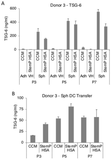 Spheroids and conditioned media, from 3–4 separate experiments, were collected from the tissue culture dish lid using a cell lifter and centrifuged at 453× g for 5 min. The supernatant was clarified by centrifugation at 10,000× g for 10 min and stored at −80 °C. To obtain sphere cell lysates, spheres were centrifuged at 453× g for 5 min, washed with PBS, centrifuged at 453× g for 5 min, and lysed with an RLT buffer from an RNeasy Mini Kit (Qiagen, Germantown, MD, USA). For TSG-6 and STC-1 ELISA, intact spheres from 3 day hanging drop cultures were transferred to 6-well low adherent dishes (Costar, Corning) for 6 h in MEMα supplemented with 2% FBS, penicillin–streptomycin, and l-glutamine.