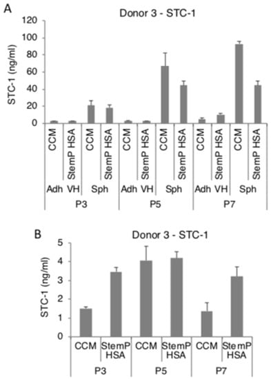 Spheroids generated from extensively expanded MSCs secrete high amounts of stanniocalcin 1 (STC-1). MSCs from various passages (3, 5, and 7) were cultured as spheroids and as very high density monolayers in FBS-containing and xeno-free media. The conditioned medium was harvested for STC-1 ELISA. Spheroids were also dissociated and the resulting cells were tested for their ability to maintain STC-1 secretion. (A) STC-1 secretion by spheroids and very high density monolayer MSCs in FBS-containing media and xeno-free media at different passages. (B) STC-1 secretion by spheroid-derived cells from FBS-containing media and xeno-free media at different passages. Abbreviations: Adh VH, adherent very high density monolayer MSCs; CCM, complete culture medium; P3, passage 3; Sph, spheroid MSCs; Sph DC, spheroid-derived MSCs; StemP HSA, StemPro xeno-free media with human serum albumin.