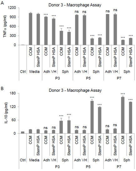Spheroids generated from extensively expanded MSCs exhibit anti-inflammatory properties. MSCs from various passages (3, 5, and 7) were cultured as spheroids and as very high density monolayers in FBS-containing and xeno-free media. Conditioned media from these cultures were applied on lipopolysaccharide (LPS)-stimulated macrophages and anti-inflammatory effects were studied. (A) Conditioned media effects on TNFα secretion by LPS-stimulated macrophages. (B) Conditioned media effects on IL-10 secretion by LPS-stimulated macrophages. Compared to the appropriate media control (i.e., CCM or StemP HSA). Statistical significance was defined as ns, p ≥ 0.05; and ***, p < 0.001, Abbreviations: Adh VH, adherent very high density monolayer MSCs; CCM, complete culture medium; Ctrl, control unstimulated macrophages; P3, passage 3; Sph, spheroid MSCs; StemP HSA, StemPro xeno-free media with human serum albumin.