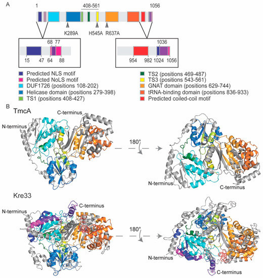 Conserved domains and motifs of Kre33. (A) Representation of yeast Kre33 highlighting the conserved domains/motifs. From left to right, the N-terminal extension (NTE), containing putative nuclear localization signal (NLS) and nucleolar localization signal (NoLS) motifs, colored in dark blue and magenta, respectively. Overlapping NLS and NoLS regions are shown in purple. The NTE is followed by a domain of unknown function called DUF1726 (light blue), a helicase domain (blue), three TmcA-specific motifs (TS1, TS2 and TS3) colored respectively in light green, dark green and yellow, a N-acetyltransferase domain (orange) and a possible tRNA-binding domain (paprika). These highly conserved domains precede a C-terminal extension (CTE) harboring a putative coiled-coil motif (red) followed by the NLS (blue) and NoLS (magenta), with overlapping regions in purple. Point mutations generated by Sharma et al. [22] are indicated. (B) Tridimensional representation of bacterial TmcA and yeast Kre33. Structures were modeled with I-TASSER [101]. Conserved motifs were colored using PyMOL with the color code used in (A).