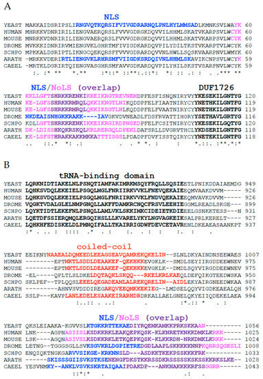 Alignment of Kre33/NAT10 from different species. Sequences from yeast, human, mouse, D. melanogaster (DROME), S. pombe (SCHPO), A. thaliana (ARATH) and C. elegans (CAEEL) were used to generate an alignment with Clustal Omega [102]. (A) The N-terminal extension precedes the DUF1726 (black bold letters) and harbors eukaryote-specific motifs, such as the NLS (blue) and the NoLS (magenta); overlapping NLS/NoLS sequences are in purple. (B) The C-terminal extension follows the tRNA-binding domain (black bold letters): it contains a coiled-coil motif (red) and finishes with the NLS (blue)/NoLS (magenta); the NLS/NoLS overlap is in purple. The putative NLS, NoLS and coiled-coil motif were identified with cNLS mapper [103], NoD [104] and COILS [105].