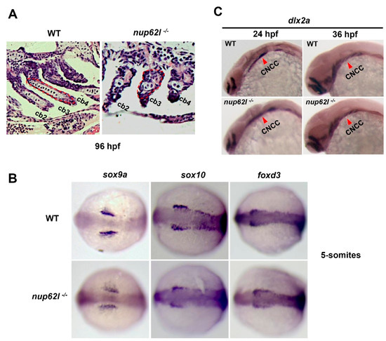 The cartilages of PA were reported to derive from CNCCs in zebrafish [45]. The formation of pharyngeal cartilages involves multiple steps, including specification of CNCCs, migration of CNCCs into seven pharyngeal segments, mesenchymal condensation formation and chondrocytes differentiation [3,6]. We first assessed the chondrocytes in PA through staining nup62l-mutants and WT siblings at 96 hpf with hematoxylin and eosin (H&E) followed by sagittal sections analysis. A large number of well-ordered chondrocytes were arranged normally within the arches of WT larvae, while a few of disorganized chondrocytes were noticed in impaired arches of nup62l-mutants (Figure 2A; Supplementary Figure S2A). To further identify the disrupted steps of cartilage formation by Nup62l deprivation, the expression of corresponding markers were detected with WISH. In nup62l-mutants, expression of the early crest markers sox9a, sox10 and foxd3 at 5-somites stage was unperturbed in comparison with that in WT controls (Figure 2B; Supplementary Figure S2B), indicating the specification of CNCCs occurred appropriately. Ventrolateral migration of CNCCs to PA was monitored by detecting the postmigratory neural crest marker dlx2a [46]. The expression of dlx2a was indistinguishable in WT and nup62l-mutants at 24 and 36 hpf (Figure 2C; Supplementary Figure S2C), suggesting an unaffected migratory behavior of CNCCs in nup62l-mutants.