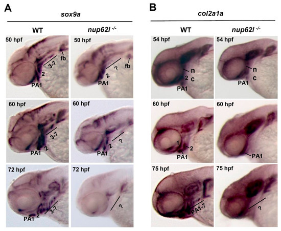 Sox9a is a transcription factor that is obligatory for chondrogenesis [47] and expressed in CNCC mesenchymal condensations in PA [48,49], and Col2a1a, a predominant extracellular matrix protein in cartilage, marks differentiating chondrocytes in PA [50,51]. A significantly attenuated expression of sox9a in PA 3-7 and a slightly reduced expression in ventral parts of the first two arches were detected in nup62l-mutants at 50 hpf. At 60 hpf, sox9a transcripts at reduced levels appeared in condensations within the first and second arches. However, the expression of sox9a was completely lost in condensations within the entire PA at 72 hpf (Figure 3A; Supplementary Figure S3A). Consistent with the fact that col2a1a expression is dependent on sox9a in CNCCs [52], nup62l-mutants exhibited an obvious reduction of col2a1a expression in PA at 54 and 60 hpf, and a complete absence of seven PA at 75 hpf (Figure 3B; Supplementary Figure S3B). Consistently, qRT–PCR analysis, used to examine the expression of sox9a, col2a1a and sox9b in nup62l-mutants and WT embryos, showed that mRNA levels of sox9a and col2a1a decreased in nup62l-mutants. However, the expression of sox9b seemed unaffected in nup62l-/- embryos when compared with that in WT (Figure S3C). These data indicate that loss of Nup62l interrupts the condensation and differentiation of pharyngeal chondrogenic progenitors, and thus leads to the hypoplastic PA in zebrafish.