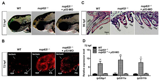 Tp53/p53 is a key signal molecule of both intrinsic and extrinsic apoptotic pathways, which can regulate the expression of genes hastening apoptosis and cell cycle arrest [54]. Abnormally elevated expression of tp53/p53 in nup62l-mutants raised the possibility that p53-dependent apoptosis might be a key cause of the PA defects. To address whether p53-deficiency could suppress the increased apoptosis and PA defects, we knocked down p53 in nup62l-mutants by the injection of p53 morpholino (p53-MO) at the one-cell stage. As shown in Figure S7A, injection of p53-MO rescued the abnormally enhanced expression of tp53 downstream target genes tp53i11a/b in a dose-dependent manner in nup62l-mutants and could restore the enhanced expression to the WT level at the dosage of 5 ng/embryo. Thus, we selected a dosage of p53-MO at 5 ng/embryo for the morphological observation and TUNEL assays at 72 hpf. We found that morphological PA defects of nup62l-mutants could be partially rescued by p53-MO injection (Figure 6A; Supplementary Figure S7B). TUNEL assays showed that the number of TUNEL-positive cells in nup62l- and p53-double deficient embryos was obviously reduced in PA, eyes and optic tectum when compared to that in nup62l-mutants but was still slightly more than that in WT siblings (Figure 6B; Supplementary Figure S7C,D). Similarly, the disorganized and shrunk chondrocytes in sagittal sections of nup62l-mutant arches were partially recovered by injection of p53-MO (Figure 6C; Supplementary Figure S7E). These data suggest an insufficient amount of p53 could mainly rescue the PA defects and apoptosis in nup62l-mutants.
