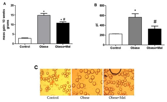 Effects of a high-fat diet (HFD) and melatonin supplementation (Mel, 1 mg/kg b.w., diluted in drinking water, daily, for 10 weeks) on body weight and adipocytes size. (A) Mice body mass gain at the end of experimental protocol. (B) Volume (in picoliters) of epididymal (EPI) isolated adipocytes. (C) Isolated EPI adipocytes photographed under optic microscope (×100 magnification). Adipocyte volume (4/3 × π × r3) was determined by measuring 100 cells per animal (six fields for each slide). Results were analyzed by a one-way ANOVA and a Tukey post-test. Values are mean ± SEM (Control n = 21; Obese n = 17; Obese + Mel n = 20). *p < 0.05 vs. control; #p < 0.05 vs. obese.