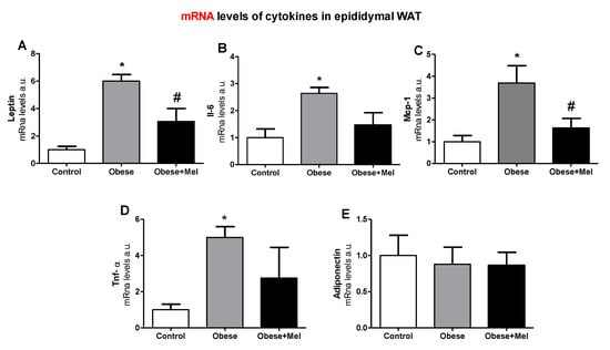 Whereas obesity is accompanied by a low-grade systemic inflammation, we evaluated the gene expression of the main adipokines produced in the visceral adipose depot from mice under an obesity condition. It was found that the HFD significantly increased the gene expression of Lep, Il-6, Mcp-1 and Tnf-α ((Figure 3A–D) compared to the Control group. Melatonin was able to prevent some of these effects, since the Obese + Mel group presented a significant reduction in the expression of Lep (50%) and Mcp-1 (55.8%) in relation to the Obese group. Moreover, the expressions of Il-6 and Tnf-α in the EPI depot of mice supplemented with melatonin were partially prevented (44.6% and 44.8%, respectively), when compared to the Obese group. No change was observed in the Adipoq gene expression (Figure 3E).