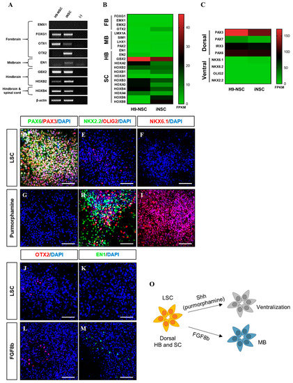 Developmental region-specific patterning of iNSCs. (A) RT-PCR analysis of forebrain, midbrain, hindbrain, and spinal cord markers in iNSCs and H9-NSCs. (B) Analysis of central nervous system (CNS) region-specific maker expression in H9-NSCs and iNSCs by RNA sequencing. FB, forebrain; MB, midbrain; HB, hindbrain; and SC, spinal cord. (C) Identification of dorsal and ventral-specific marker expression in H9-NSCs and iNSCs by RNA sequencing. (D–I) Purmorphamine treatment induces ventral markers (NKX2.2, OLIG2, and NKX6.1) and decreases dorsal markers (PAX3 and PAX6) of iNSCs, as determined by immunofluorescence analysis. (J–M) Forebrain marker (OTX2) and midbrain marker (EN1) expression in iNSCs under LSC culture medium or FGF8b treatment, as determined by immunofluorescence analysis. (O) Schematic diagram of region-specific patterning of iNSCs. Scale bars, 200 μm.