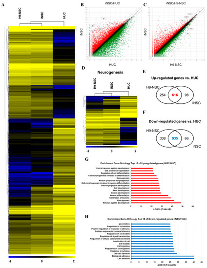 RNA sequencing analysis of the global gene expression profile of iNSCs. (A) Hierarchical clustering analysis of global gene expression in H9-NSCs, iNSCs, and HUCs. Two thousand two hundred and thirty-seven genes are selected with significant p-value (p < 0.05) and fold change (FC > 2). (B,C) Scatter plots of gene expression in iNSC vs. H9-NSCs or HUCs. (D) Hierarchical clustering analysis of gene expression related to neurogenesis in H9-NSCs, iNSCs, and HUCs. Two hundred ninety-nine genes are selected with significant p-value (p < 0.05) and fold change (FC > 2). (E) Venn diagrams show up-regulated genes H9-NSCs and iNSCs vs. HUCs. (F) Venn diagrams show down-regulated genes H9-NSCs and iNSCs vs. HUCs. (G) Gene ontology analysis of top 15 up-regulated genes in iNSCs vs. HUCs. (H) Gene ontology analysis of top 15 down-regulated genes in iNSCs vs. HUCs.