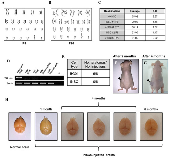 To assess the biological safety of iNSCs, we first evaluated chromosomal stability by karyotyping analysis. The iNSCs established from four healthy donors preserved a normal karyotype (Figure 7A and Supplementary Figure S2J–L) and no significant differences in cell doubling time with normal karyotype between passages 8 and 20 (Figure 7B,C). Next, we confirmed existence of the residual VEE-RNA species in the cytosol of iNSCs or integration to their genomic DNA during iNSCs generation. We traced VEE-RNA species from iNSCs by PCR when compared to VEE-OKSiG RNA-transfected HUCs at 48 h post-transfection, serving as a positive control. As shown in Figure 7D, no VEE expression was detected in the RNA pool of HUC derived-iNSCs and their genomic DNA (Figure 7D). Additionally, the injected iNSCs into back trunk of immunodeficient nude mice did not form teratomas over four months, comparable to the ESC sites (Figure 7F,G), and when transplanted into brain of nude mice, did not induce aberrant tissue morphology over six months, implying the absence of tumorigenic potential of iNSCs (Figure 7H). These findings clearly indicate that the established iNSCs are transgene-free with lack of tumorigenicity.