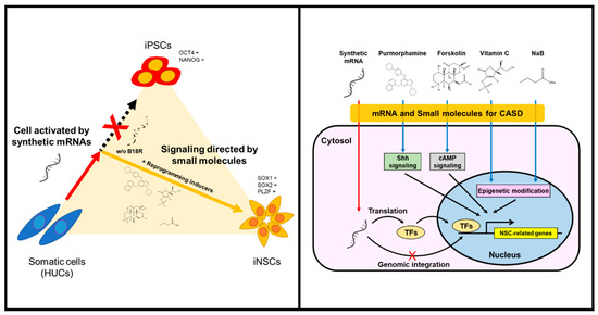 Most neurological disorders lead to irreversible damage to the central nervous system (CNS) upon disease progression due to the limited potential of CNS repair via endogenous neurogenesis. This medical dilemma has been lasted before the discovery of neural stem cells (NSCs) in the 1960s, offered considerable promise for CNS regeneration in patients [1]. Since then, several studies have focused on expansion of human NSCs in vitro and evidence of neurogenesis in several regions of the mammalian CNS [2,3,4,5]. However, the scarcity and poor accessibility of primary NSC populations from adult neurogenesis hinder their preclinical and clinical applications [6,7]. In this context, the generation of NSC populations from pluripotent stem cells (PSCs), including embryonic stem cells (ESCs) and induced pluripotent stem cells (iPSCs), has been spotlighted as a promising alternative. Especially, because of the major issues facing immune rejection and ethical concerns for transplantation of ESC-derived NSCs in clinical trials, the advent of patient-specific iPSCs obtained from somatic cells has been hailed as a revolutionary source for personalized medicine [8]. The generation of iPSCs by forced expression of a defined set of transcription factors, OCT4, SOX2, KLF4, and c-MYC (also known as Yamanaka factors) is a fairly straightforward and robust technology, which has been explored for a better understanding of human development and diseases processes, discovering therapeutics [9]. Meanwhile, for their clinical trial transparency, the re-differentiated cells from iPSCs must be addressed in feasibility in precise control of PSCs differentiation and formation of teratomas in vivo by undifferentiated population from PSCs. For bypassing a pluripotent stage, direct conversion of cell fates employing the cell-activation and signaling-directed (CASD)-induced lineage transition, mediated by Yamanaka factors and lineage-specifying cocktail of small molecules, has enable to produce a wide range of cell types, including neurons [10], neural progenitors [11], NSCs [12], cardiomyocytes [13], and hepatocyte-like cells [14]. Despite these impressive exhibitions of cell fate conversions, the viral vector-mediated gene delivery system lead to chromosomal integration of exogenes in host genome, restricting their access to clinical trials. Related studies have shown encouraging results in avoiding the chromosomal integration by employing non-integrative delivery systems, including episomal plasmids, adenovirus, and Sendai virus [15,16]. However, these methods require a time- and cost-consuming process to permanently erase the residual transgenes from host cells for preventing the risks caused by uncontrolled exogenes reactivation [17,18]. Another study using synthetic mRNA encoding the reprogramming factors has showed the generation of integration-free iPSCs without additional transgene deletion process [19], nonetheless, the use of extremely short-lived mRNA species required to repeat the transfection during conversion process, which could trigger to cellular stress responses, thus leading to poor reproducibility. In contrast, self-replicative mRNA delivery system employing Venezuelan equine encephalitis (VEE) replicon have showed the generation of iPSCs with high efficiency in a single transfection, thereby contributing to fine reproducibility in mRNA-based reprogramming [20]. Therefore, a self-replicable mRNA delivery system would be an excellent candidate for clinical applicable CASD-based lineage transition.
