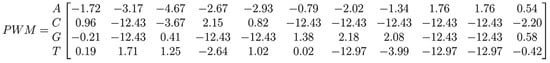 Given a set X of N aligned sequences of length l, the elements of the PPM are calculated by dividing the nucleotide count by the number of sequences (N) where i ∈ {1, …, N}, j ∈ {1, …, l}, k ∈ {A, C, G, T}, and I (a = k) is an indicator function. Pseudocounts equal to 0.8 were applied to avoid matrix null entries [29]. The PPM was converted in position weight matrix (PWM) through the log likelihood calculation (Equation (2): Position weight matrix (PWM) definition) (Figure 2).