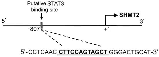 STAT3 transcription factor binding site (TFBS) analysis was performed on the entire putative promoter region 3123 bp upstream of SHMT2 gene on human chromosome 12. The transcription factor matrix (TFM) of STAT3, obtained from Jaspar DB 2018, was used to analyze the selected region for the STAT3 cis elements identification [26,27,28]. A putative STAT3 cis-element motif (CTTCCCAGTAG) at −807 bp upstream position from the start of SHMT2 gene was identified (Figure 3).