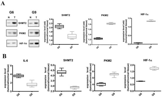 SHMT2, PKM2 and HIF-1α levels were analyzed in 63 FFPE samples, corresponding to the same tissue samples used in our previous study [8]. Western blot analysis confirmed that SHMT2 is more expressed in G6 tissues, while PKM2 in G9 ones; HIF-1α is increased only in G9 samples (Figure 10A). To verify that the observed different protein levels could be related to a different inflammatory state (IL-6 mediated), the mRNA level of this cytokine was analyzed in the same tissue samples. RT-PCR results confirmed a higher expression of IL-6 in G6 samples that could be related to an inflammatory condition and the subsequent activation the JAK2/STAT3 pathway (Figure 10B).