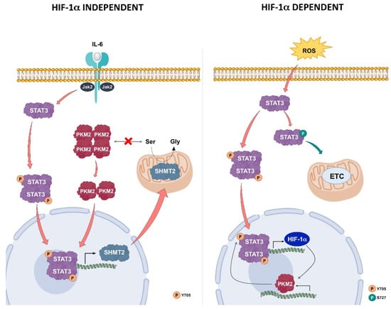 As stated above, serine, the substrate of SHMT2, is an allosteric positive regulator of PKM2 and stabilizes the tetrameric cytosolic form of the enzyme, which is involved in the glycolytic pathway. A drop of serine concentration, due to an augmented SHMT2 activity as consequence of its over-expression, favors the transition of PKM2 from the tetrameric to the dimeric form. This conversion slows the glycolytic flux and increases the lactate/pyruvate ratio, resulting in the observed metabolic shift. Furthermore, the dimeric form of PKM2 can translocate into the nuclear compartment, where it can behave either as a protein kinase or as a transcriptional co-activator [46]. Hence, during inflammatory conditions, STAT3 could activate a pathway involving SHMT2 and PKM2. In this protein axis, PKM2 nuclear activity is regulated by STAT3 via SHMT2 in a HIF-1α-independent manner. Thus, a different and new loop implicating STAT3/SHMT2/PKM2, instead of STAT3/HIF-1α/PKM2, can be active under inflammatory conditions, leading to a metabolic shift (Figure 11). This metabolic set-up is sustained by an increased expression of SHMT2, whose importance in the mitochondrial energetic metabolism has been very recently reported [19].