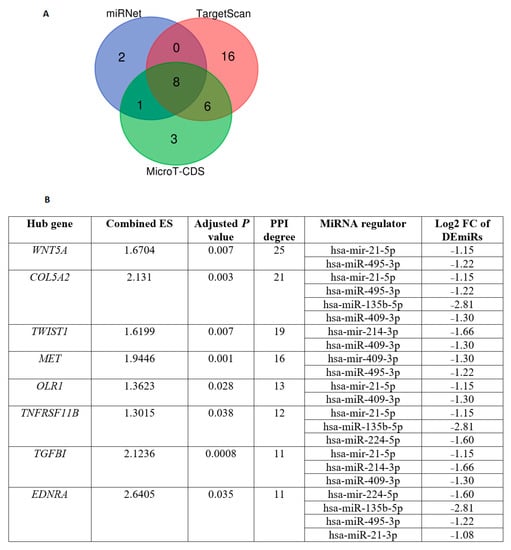 Identification of hub genes targeted by DEmiRs. (A) A total of eight hub genes were identified as the targets of downregulated DEmiRs in CTS which were commonly predicted by all three different tools (miRNet [18], MicroT-CDS [38], and TargetScan [22]). (B) A detailed description of the eight hub genes and their associated regulatory DEmiRs. ES: effect size. FDR: false discovery rate.