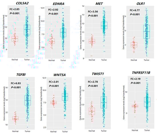 Comparisons of the expression levels of the eight hub genes between TCGA colon cancer and normal tissue. COL5A2, EDNRA, TGFBI, MET, OLR1, TNFRSF11B, TWIST1, and WNT5A are upregulated in colon cancer versus normal samples (Student′s t test, p < 0.001). FC: Fold change.