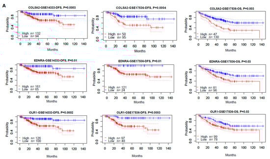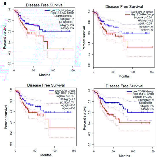 Survival analyses using Prognoscan [24] showed that three hub genes (COL5A2, EDNRA, and OLR1) had a negative expression correlation with survival prognosis (overall survival (OS) and/or disease-free survival (DFS)) in CRC (Figure 3A). Moreover, the elevated expression of COL5A2, EDNRA, TGFBI, and OLR1 was associated with a worse DFS prognosis in TCGA COAD (Figure 3B). Previous studies have shown that some of the hub genes are associated with prognosis in colon cancer. For example, the depressed expression of EDNRA is associated with a better prognosis in colon cancer [62]. Taken together, these data demonstrate that the upregulated hub genes regulated by the downregulated DEmiRs in CTS are negative prognostic factors in colon cancer.