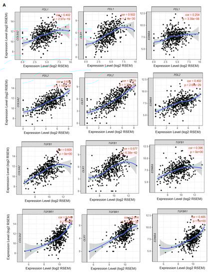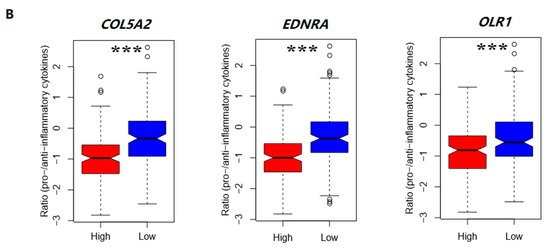 The tumor-infiltrating lymphocytes (TILs) level is an independent predictor of survival in CRC [63]. We analyzed the correlations between the expression levels of three hub genes and the levels of TILs in TCGA COAD. The three hub genes included COL5A2, EDNRA, and OLR1 which were identified as negative prognostic factors in both TCGA COAD [33] and two microarray CRC cohorts (GSE17536 [30,31] and GSE14333) [32]. Interestingly, we found that the elevated expression of the three genes was consistently correlated with the upregulation of immunosuppressive signatures in colon cancer, such as tumor-associated macrophages (TAMs), M2 macrophages, regulatory T cells (Tregs), and T cell exhaustion (Table 3). Moreover, the expression levels of the three genes exhibited significant positive correlations with the expression levels of immune-inhibitory marker genes, including PD-L1, PD-L2, TGFB1, and TGFBR1 (Figure 4A). Interestingly, we found that the ratios of pro-/anti-inflammatory cytokines were significantly lower in the colon cancers highly expressing the hub genes (expression levels > median) than in those lowly expressing the hub genes (expression levels < median) in the TCGA COAD cohort (Student’s t test, p < 0.001) (Figure 4B). Altogether, these results suggest that the elevated expression of these hub genes is associated with the immunosuppressive TME in colon cancer that could explain their oncogenic function to a certain degree.