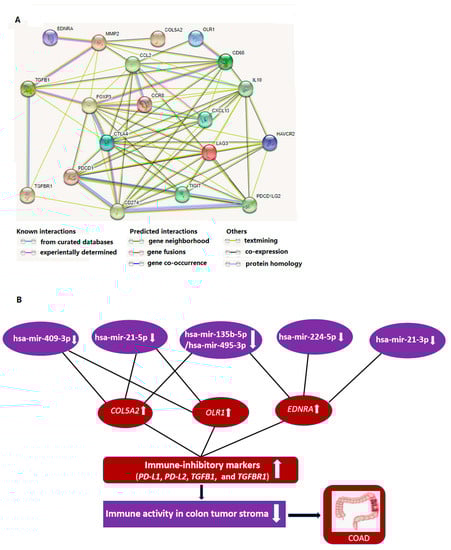 Interaction networks of prognostic hub genes, immune-inhibitory signature genes, and DEmiRs. (A) Interaction network of the three prognostic hub genes (COL5A2, EDNRA, and OLR1) and the marker genes of immune-inhibitory signatures (TAMs, Tregs, and T cell exhaustion). This network was constructed by STRING [26]. TAMs: tumor-associated macrophages. Tregs: regulatory T cells. (B) The miRNA–mRNA regulatory network of the three prognostic hub genes and their DEmiR regulators that may contribute to the pathogenesis of colon cancer.