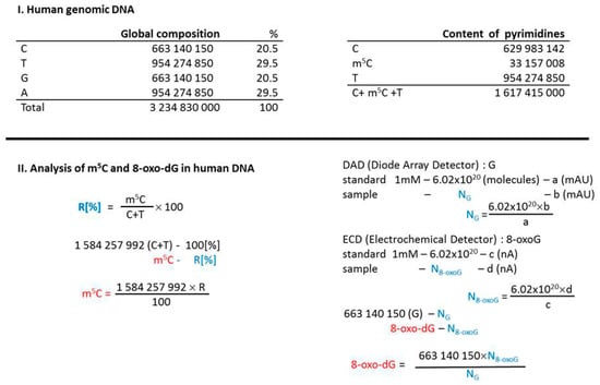 Calculations leading to determine the 5-methylcytosine (m5C) and 8-oxo-deoxyguanosine (8-oxo-dG) contents in examined DNA samples. Human genomic DNA composition data were taken from [27].