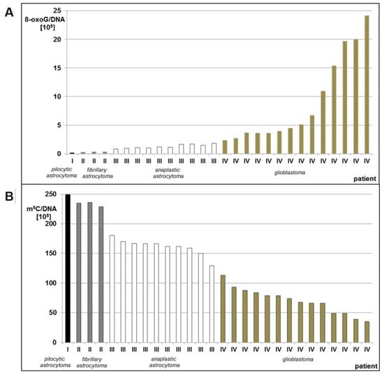 For 28 patients, the total level of m5C and 8-oxo-dG in genomic DNA from brain tumor tissue was analyzed (Table S1). There were variations in the contents of both compounds in the tumor histological subgroups, most clearly seen for glioblastoma group, reflecting the heterogeneity of those tumors (Table S1, Figure 2).
