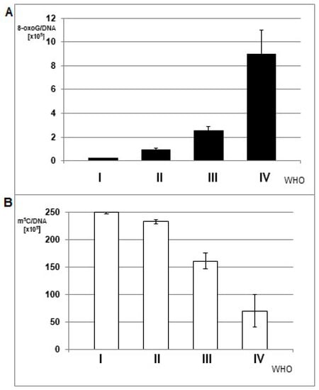 The mean amounts of 8-oxo-dG were increasing with increasing tumor grade, while total DNA methylation was decreasing (Figure 3). The differences between the subgroups comprising tumors of the same grade were statistically significant. The ANOVA test for 8-oxo-dG showed F= 4.873 and p = 0.009; only for WHO groups III and IV, F = 10.346, p = 0.004; whereas for m5C, F = 107.194 and p < 0.005.