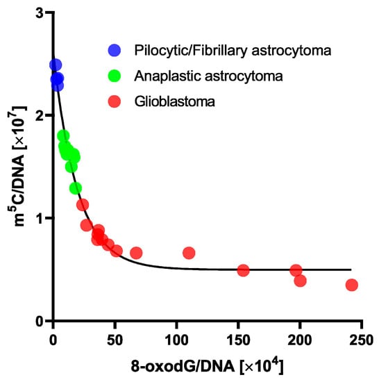 One phase decay curve of m5C in relation to 8-oxo-dG contents in DNA from human brain tumors tissues. 8-oxo-dG allows subdividing gliomas within a similar total DNA methylation level.