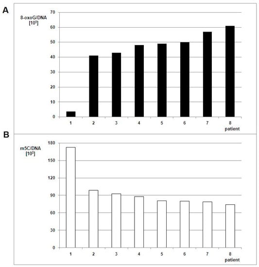 For eight glioma patients, we analyzed the total level of m5C and 8-oxo-dG in genomic DNA from peripheral blood samples (Table S2). The group included seven glioblastoma (WHO IV) patients along with one anaplastic astrocytoma (WHO III) for comparison. The total DNA methylation levels were almost equal in that group (Table S2, Figure 5).