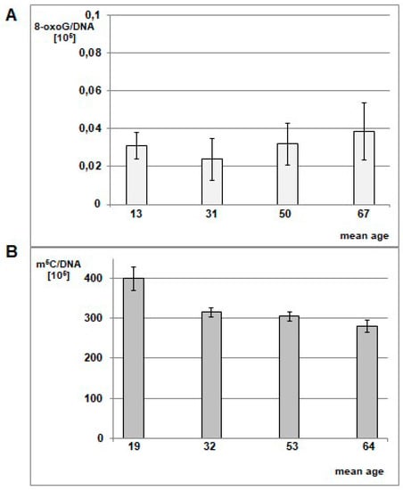 Mean level of 8-oxo-dG (A) in leukocyte DNA in healthy individuals cohort divided into mean age groups of 13, 31, 50, and 67 y.o. The graph was prepared based on data taken from Siomek et al. 2007 [30], 8-oxo-dG values were recalculated per genome. One can see the minute amounts of 8-oxo-dG in healthy subjects. (B) Mean amount of m5C in DNA from peripheral blood samples of healthy individuals in different age groups. The cohort (Table S3) was divided into 4 age groups: <21 y.o. (mean age 19), 21–40 y.o. (mean age 32), 41–60 y.o. (mean age 53), >60 y.o. (mean age 64). The amounts of m5C were significantly higher than in glioma patients.
